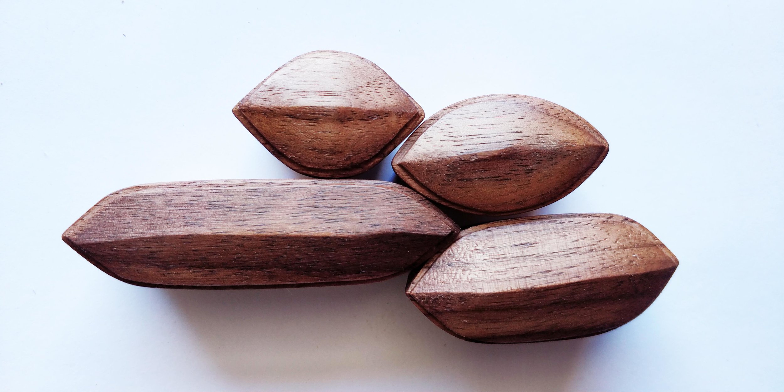 Hand-carved knob families in walnut. From top right: Shell, Husk, Leaf, Cup, Hull, Block, Dish, Mound, Pebble.